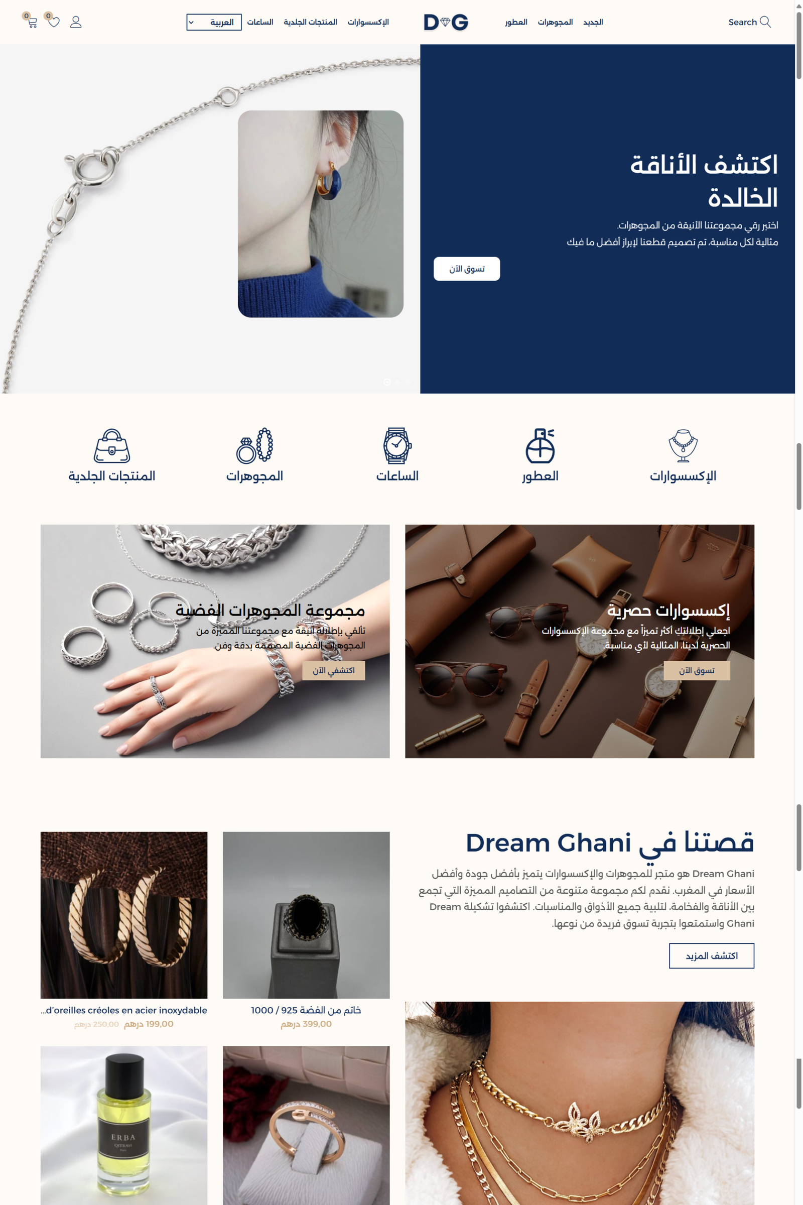 As a skilled WordPress developer, I crafted the Dreamghani.ma e-commerce website, specializing in jewelry and accessories based in Morocco. The store, Dream Ghani, features a sophisticated design with a blue and beige color scheme, creating an elegant and inviting online shopping experience. The site is fully responsive, ensuring seamless navigation across all devices. My expertise in e-commerce solutions guarantees a user-friendly interface, secure transactions, and a visually appealing platform that reflects the brand’s unique identity. By integrating advanced features and aesthetic finesse, I deliver exceptional online stores that captivate and convert visitors.