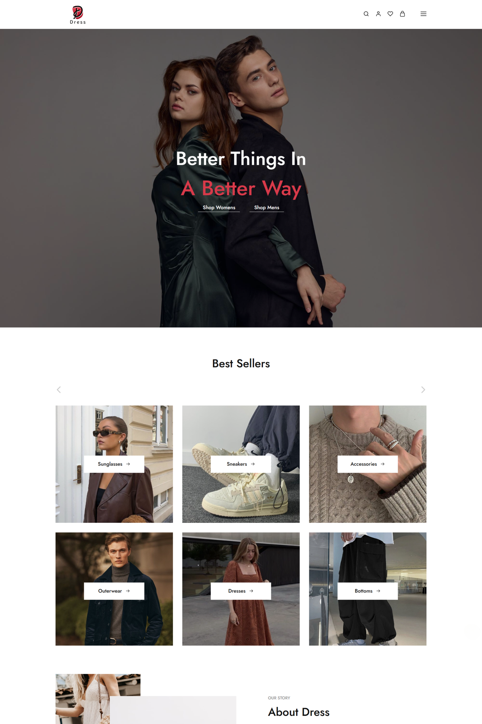 I developed DressMe.Tech, an e-commerce platform dedicated to offering a diverse selection of clothes, accessories, and kids’ apparel. Utilizing a modern and user-friendly theme, the website is designed to provide a seamless shopping experience that reflects the brand’s commitment to elegance and style. The homepage features dynamic sections showcasing best sellers, top items of the week, and customer reviews, all aimed at engaging visitors and highlighting the brand’s unique offerings.