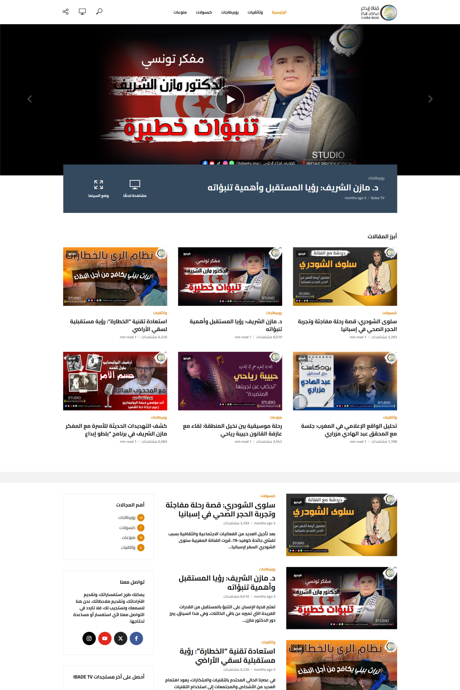 I am the developer behind IbdaeTV.ma, a dynamic Arabic news website created using WordPress and specialized news plugins. My work focused on crafting a user-friendly platform that seamlessly delivers a diverse array of content, including documentaries, reports, capsules, and entertainment.